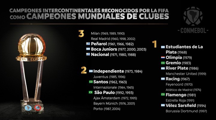 Hoy vemos reflejados nuestros esfuerzos en un justo reconocimiento que la FIFA hace a los clubes sudamericanos y europeos que ganaron la Copa Intercontinental y tradicionalmente fueron considerados campeones del mundo”, explicó Alejandro Domínguez, presidente de la Conmebol.