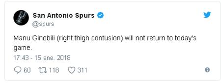 En la cuenta oficial de Twitter de los Spurs anunciaron la lesión de Ginóbili y advirtieron que no volverá a jugar en el partido de este lunes.