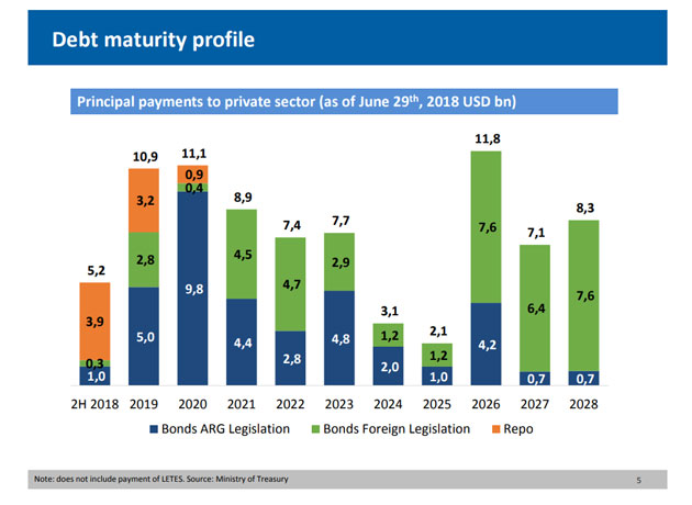Para el año que viene se debe hacer frente a vencimientos por u$s10.900 millones. La mitad (u$s5.000 millones) están nominados en bonos bajo jurisprudencia argentina. Y u$s2.800 millones bajo leyes extranjeras. Y los restantes u$s3.200 millones son parte de un "repo".
