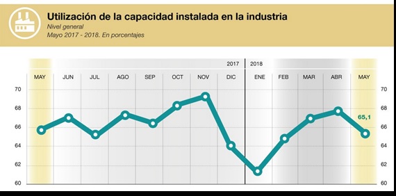 El INDEC publicó su informe que refiere a que la utilización de la capacidad instalada en la industria arribo al 65,1% en el mes de mayo de 2018, que fue inferior al registrado en el mismo mes del año anterior (65,8%)