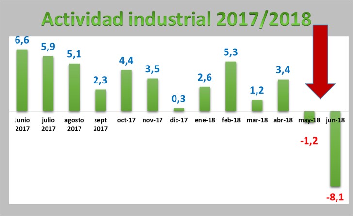 El Organismo estadístico informo la situación de la actividad industrial en nuestro país al mes de junio de 2018, en este marco público que la industria presenta una baja de -8,1% respecto a junio del año 2017.