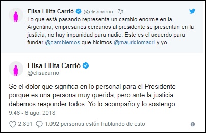 Tras la declaración del empresario primo de Mauricio Macri, la diputada Elisa Carrió declaró: “Ante la Justicia debemos responder todos. Yo lo acompaño y lo sostengo”.