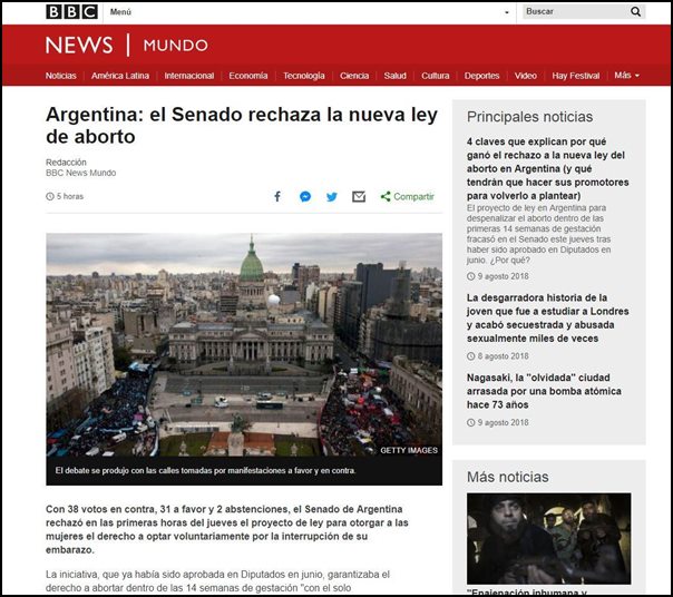 BBCCon el título "Argentina: el Senado rechaza la nueva ley de aborto", la BBC fue una de las primeras en contar la noticia. La nota estuvo acompañada por una fotografía que mostró a la inmensa marea verde y celeste que se reunió en las inmediaciones del Congreso y catalogó como "histórico" el debate que se produjo en el país.