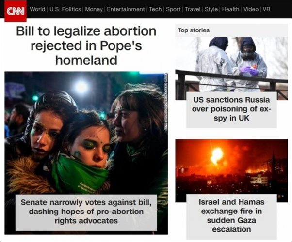 CNNLa cadena de los Estados Unidos destacó la decisión "en la patria del Papa" y manifestó que el Senado "aplastó las esperanzas de los defensores de los derechos pro-aborto". La nota estuvo acompañada por una fotografía que muestra la tristeza de unas jóvenes en favor de la iniciativa.