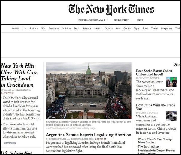 The New York TimesEl diario norteamericano refló que "los defensores de la legalización del aborto en la patria del Papa Francisco fueron aplastados pero no adoptados tras perder la batalla final legislativa".