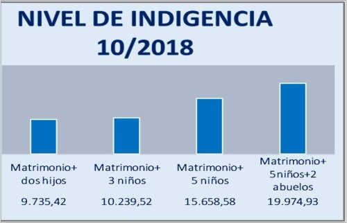 Así tenemos a un grupo familiar de matrimonio y dos hijos, requieren $ 9735,42 por mes. En otro caso, un matrimonio con 3 hijos, necesita $ 10.239,52 y si fuera con cinco hijos, su demanda dineraria es de $ 15.658,58 y finalmente si se suman dos abuelos, el valor necesario es de $ 19.974,93