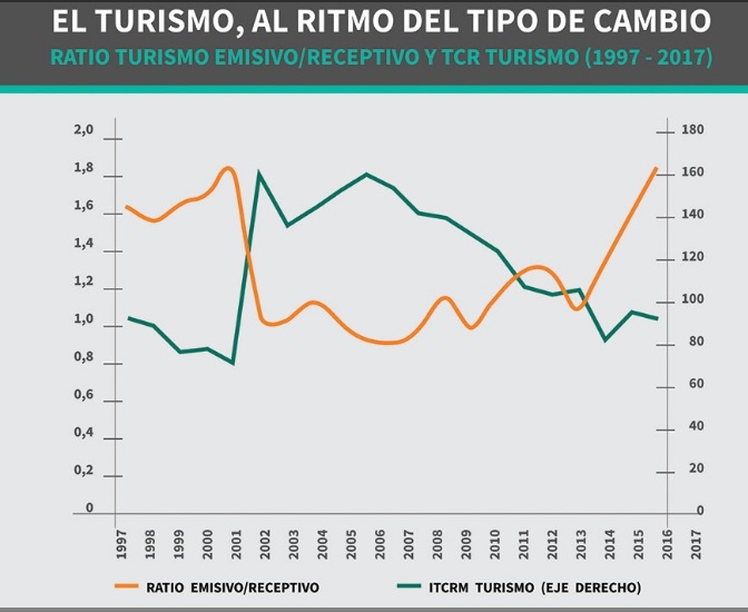 "Esta dinámica se ha profundizado nuevamente en los últimos años", plantea, para luego destacar que, tras el sacudón que el billete verde experimentó a partir de julio, "la relación entre turismo emisivo y receptivo se ha visto significativamente alterada".