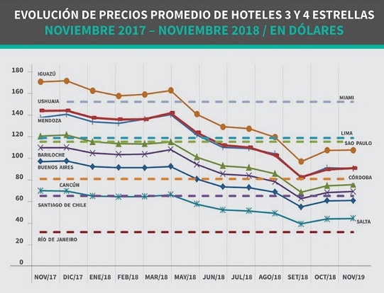 Si se toman los precios de establecimientos de tres y cuatro estrellas en diferentes plazas del país y se los cruza con los de otros destinos internacionales, se observa un significativo abaratamiento, en términos de dólar: según el Ieral, las tarifas medidas en divisas se desplomaron casi 40% en promedio, entre abril –cuando se aceleró la disparada del dólar- y noviembre pasado.