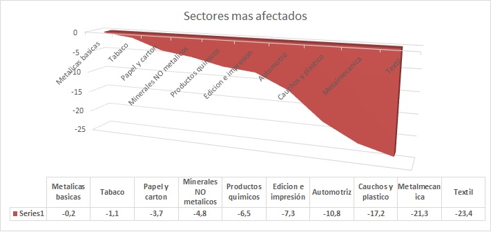 La Industria textil muestra una caída del -23,4%; la Industria metalmecánica, excluida la automotriz -21,3%: el Productos de caucho y plástico -17,2%; la Industria automotriz - 10,8%; la Edición e impresión -7,3%; Productos químicos -6,5%; minerales no metálicos -4,8%; papel y cartón -3,7%, tabaco -1,1% e industrias metálicas básicas -0,2%.