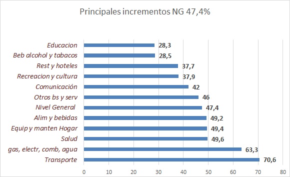 PRINCIPALES INCREMENTOS DE BIENES EN EL ACUMULADO ANUAL En referencia al incremento inter anual de bienes y servicios, cuya media en el nordeste argentino es del 47,4%, podemos enunciar que las de mayores crecimientos son el transporte con un 70,65; en el caso del gas, combustible, agua, la suba es del 63,3%: del rubro salud un 49,6%: de equipamiento y mantenimiento del hogar un 49,4%; alimentos y bebidas un 49,2%, En cuanto a los de menores incrementos tenemos a educación con 28,3%; bebidas alcoholicas y tabaco un 28,5% : restaurantes y hoteles un 37,7%, recreación y cultura un 37,9%, comunicación un 42% y otros bienes y servicios un 46%