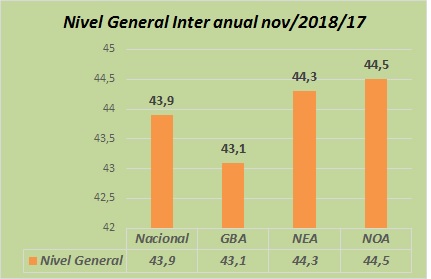 NIVEL DE PRECIOS ANUALIZADOS En cuanto al nivel general de precios medidos en forma inter anual, es decir noviembre de 2017 y noviembre de 2018, es la siguiente: Nacional 43,9%; GBA 43,1%; NEA 44,3% u MPA 44,5%.