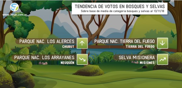 Tendencia de Votos en Bosques y Selvas:La Selva Misionera y el Parque Nacional Los Alerces son los más votados del momento, en tanto que el Parque Nacional Los Arrayanes de Neuquén, y el Parque Nacional Tierra Del Fuego necesitan aumentar su campaña ya que se observa una caída en la tendencia de los votos de esos candidatos para las #7MaravillasNaturalesArgentinas.