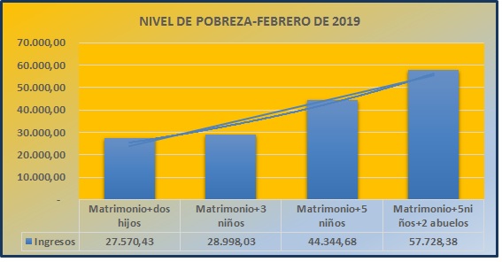 Así tenemos el primer caso de la familia tipo a $ 27,570,43 un matrimonio con 3 niños es de $ 28.998,03; con cinco hijos $ 44.344,68 y finalmente con la inclusión de dos abuelos, para no ser POBRES su requerimiento es de $ 57.728,38