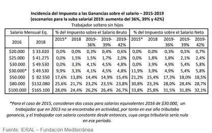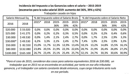 Para un trabajador con salario de poder adquisitivo constante en 2016 de $50.000 (que percibió en 2018 un salario bruto de $82.550), la carga del impuesto fue del 17,6% en 2015, 13,9% en 2016, y 10% en 2017. En 2018 se incrementó nuevamente al 13,8% y en 2019 podría alcanzar un peso de entre 14,4% y 15,4%, dependiendo cuál sea finalmente el aumento salarial.