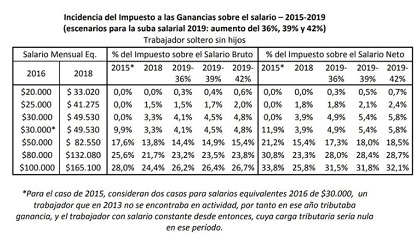 Los trabajadores sin cargas de familia —solteros sin hijos— con salarios de $33.020 y $41.275 en 2018 (equivalentes a $20.000 y $25.000 de 2016), que en 2015 se encontraban exentos del impuesto, en 2018 y en el corriente año, se encuentran alcanzados por el tributo independientemente del aumento salarial que obtengan.