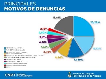 No respetar la parada, falta de frecuencia, conducir de forma imprudente, trato desconsiderado del conductor, deficiencias mecánicas del vehículo y desvío del recorrido lideran el ranking de los mayores reclamos en el Portal de Denuncias de la CNRT. Desde su implementación hasta la actualidad se registraron más de 9.400 reclamos por medio de la plataforma www.servicios.cnrt.gob.ar y a través de su centro de atención telefónico, que opera las 24 hs.