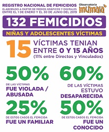 De acuerdo al relevamiento realizado por el “Observatorio MuMaLá. Mujeres, Disidencias, Derechos”, que se realiza a partir de medios gráficos y digitales de todo el país, se registraron desde el 1 de enero al 30 de junio de 2019 hubo 132 femicidios en nuestro país.