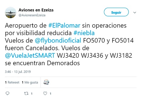 En El Palomar, en tanto, no hay operaciones por visibilidad reducida. Los vuelos FO5070 y FO5014 de Flybondi fueron cancelados, mientras que los vuelos WJ3420, WJ3436 y WJ3182 de Jetsmart se encuentran demorados.