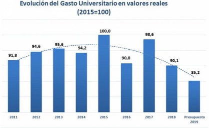 * Evolución del presupuesto universitario vs. inflación acumulada: el presupuesto universitario perdió 23,7 puntos porcentuales con respecto a la inflación durante el período 2016/2018. Si se considera el impacto de la inflación esperada en 2019, y si no se amplía el presupuesto vigente para disminuir la brecha, la pérdida llegará a 72,5 puntos porcentuales.