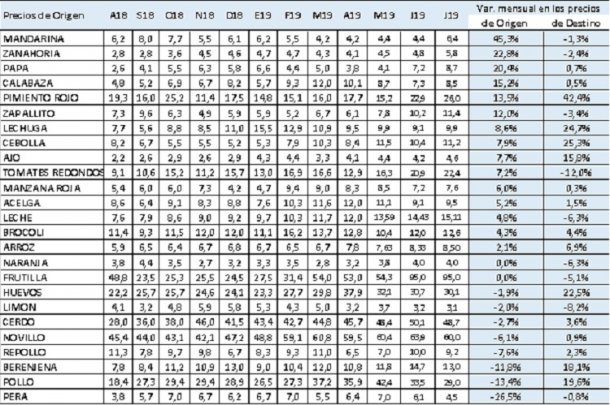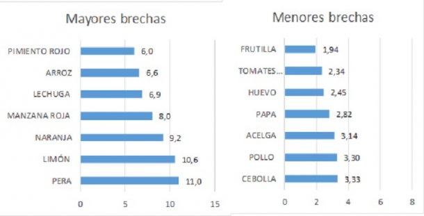 Los productos con menores desproporciones en el mes, en tanto, fueron: la frutilla, donde los costos desde que salieron de la chacra apenas se multiplicaron por 1,94 veces, logrando una brecha baja, seguido por el tomate 2,34 veces, el huevo 2,45 veces y la papa 2,82 veces.