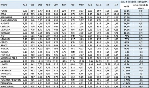 Con esos resultados, la participación del productor en el precio final se redujo 1,7%. Asimismo, el informe destacó que de los 25 productos relevados, 13 subieron las brechas y 12 bajaron.