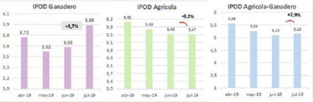En julio, el IPOD agrícola bajó 0,2%, llevando su desigualdad a 5,47 veces, 13,9% menor a la del mismo mes del año pasado, mientras que el IPOD ganadero subió 8,7%, a 3,89 veces.