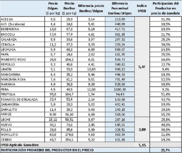El aumento en la brecha "se tradujo en un leve deterioro en la participación promedio del productor en el valor final del producto, que se redujo a 23,7%", indicó la entidad.