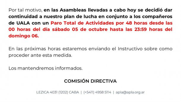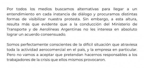 La medida de fuerza fue anunciada por APLA, el gremio mayoritario de los pilotos de Aerolíneas Argentinas, pero "en conjunto con los compañeros de UALA", es decir que los pilotos de Austral también van a adherir.