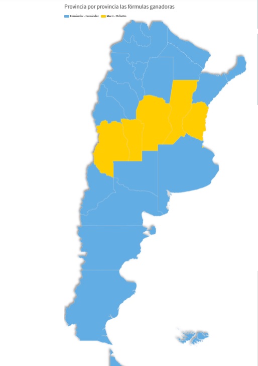 Con el 85% de las mesas escrutadas Macri obtuvo el 51,96% de los votos en la Ciudad de Buenos Aires frente al 35,99% de Alberto Fernández. En Córdoba con el 97% de las mesas escrutadas Juntos por el Cambio gana con el 61,36% de los votos frente al 29,21 del Frente de Todos mientras que en Mendoza, con el 96,10% de las mesas escrutadas Macri ganó con 50,37% de los votos frente al 37,53% de Fernández.