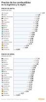 En el mercado local, desde el jueves pasado, el litro de nafta súper se comercializa en alrededor de $50 (unos USD 0,79 centavos) y el litro de diesel a $47 (unos USD 0,74 centavos), tomando los precios de la ciudad de Buenos Aires. En la comparación con los países de América Latina y los Estados Unidos, esos precios están solo por encima de algunos países, como los Estados Unidos, Colombia, Bolivia, Ecuador y Venezuela, según un relevamiento de la plataforma Global Petrol Prices.