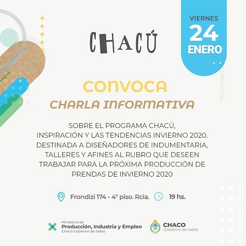 El Ministerio de Producción, Industria y Empleo invita a diseñadoras y diseñadores chaqueños a participar de la convocatoria abierta que llevará adelante el programa Chacú este viernes 24, a las 19, en Incubadora Empresa Joven, ubicada en el cuarto piso de Frondizi 174.