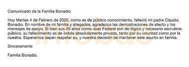 Mariano Fulvio Bonadio, hijo del magistrado fallecido, difundió en nombre de la familia un breve escrito, en el que pidió además respetar la privacidad de sus personas más cercanas en este momento de dolor.