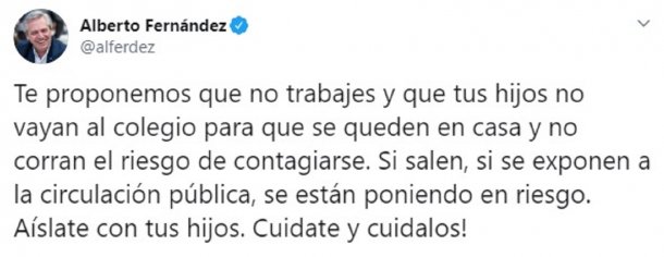 "Te proponemos que no trabajes y que tus hijos no vayan al colegio para que se queden en casa y no corran el riesgo de contagiarse. Si salen, si se exponen a la circulación pública, se están poniendo en riesgo. Aíslate con tus hijos. Cuidate y cuidalos!", tuiteó este lunes por la noche Alberto Fernández luego de que trascendió el caso de una importante cantidad de personas que se congregaron en Monte Hermoso.