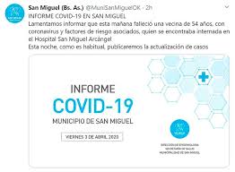 Desde el municipio de San Miguel ratificaron la noticia a través de Twitter: “Lamentamos informar que esta mañana falleció una vecina de 54 años, con coronavirus y factores de riesgo asociados, quien se encontraba internada en el Hospital San Miguel Arcángel. Esta noche, como es habitual, publicaremos la actualización de casos”.