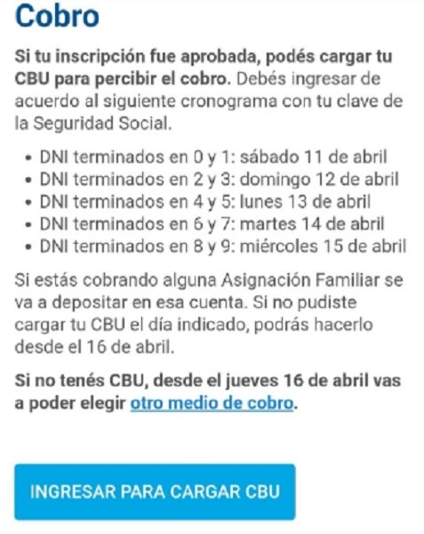 También pueden consultar desde el 15 de abril, en el portal público de Anses.gob, opción Ingreso familiar de Emergencia, la fecha de Cobro, o bien, esperan el Mensaje de Texto o correo electrónico.