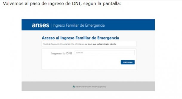 Se ingresa con la clave de ANSES y seguir las instrucciones. El sistema guiará al beneficiario del Ingreso Familiar de Emergencia durante todo el proceso.