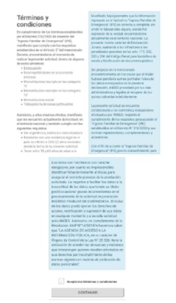 En esta opción, luego del ingreso con Clave Anses, de inmediato nos pide aceptar los Términos y Condiciones.