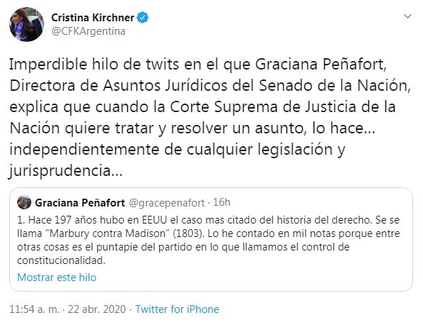 “Cuando la Corte Suprema de Justicia de la Nación quiere tratar y resolver un asunto, lo hace… Independientemente de cualquier legislación y jurisprudencia”, escribió Cristina en su perfil de Twitter.