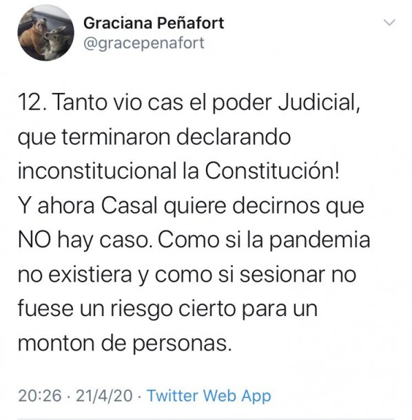 Sin embargo, el 21 el procurador interino Eduardo Casal dictaminó que no es competencia de la Corte Suprema de Justicia dirimir el pedido de la vicepresidenta para dar "validez legal" a eventuales sesiones remotas del Congreso en medio de la pandemia de coronavirus.