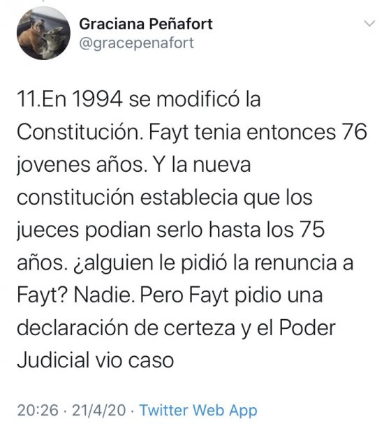 A través de las redes sociales, la vicepresidenta publicó una serie de tuits criticando el accionar del Tribunal y compartiendo publicaciones de la Directora de Asuntos Jurídicos del Senado de la Nación, Graciana Peñafort, quien puso como ejemplos los casos de Carlos Fayt y Bussi.