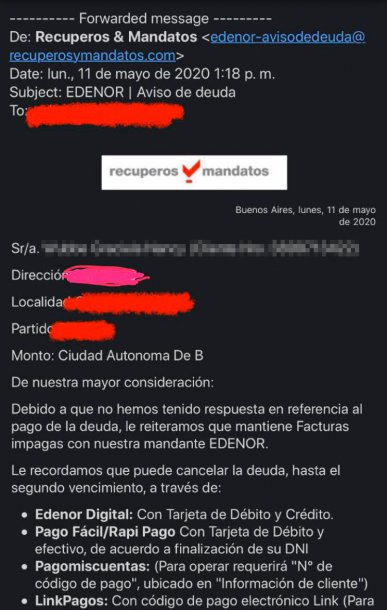 Así lo evidencia el contacto que recibió ayer una de las usuarias de Edenor de parte de la empresa Recuperos y Mandatos.