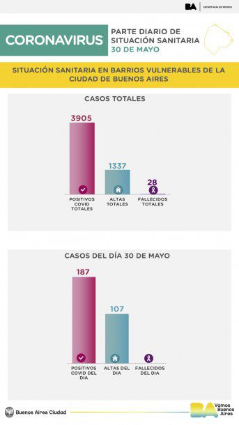 Un total de 187 personas fueron diagnosticadas en las últimas 24 horas con coronavirus en barrios vulnerables de la ciudad de Buenos Aires, con lo que suman 3.905 los infectados con Covid-19 en esos conglomerados, informó esta mañana el Gobierno porteño.