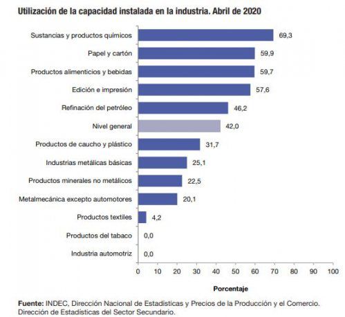 En el primer mes completo de aislamiento obligatorio, la utilización de la capacidad instalada de la industria bajó casi 20 puntos interanuales según INDEC.