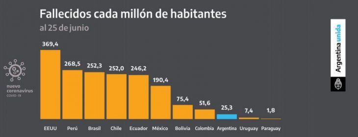Mientas en EEUU, Brasil, Perú, Chile y Ecuador se registran más de 200 fallecidos cada millón de habitantes, en Argentina son apenas 25.