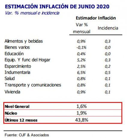 La inflación de junio fue de 1,6% mensual y registró un crecimiento interanual de 43,8%, según el IPC-OJF (GBA), dado a conocer este miércoles.