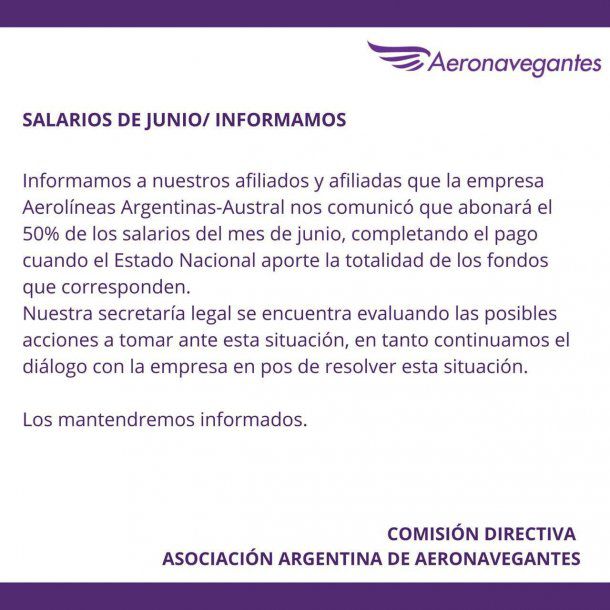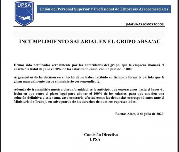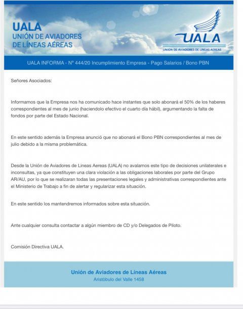 UPSA (el gremio de los jerárquicos), AAA (Aeronavegantes) y UALA (aviadores) enviaron sendos flyers a sus agremiados explicando la situación. Los trabajadores verán depositado el 50% de sus haberes con un mínimo de 35 mil pesos.