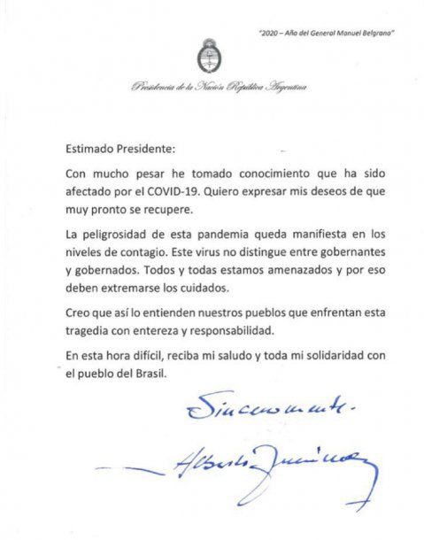 "Estimado Presidente: con mucho pesar he tomado conocimiento que ha sido afectado por el Covid-19. Quiero expresar mis deseos de que muy pronto se recupere", dice Alberto Fernández en sus primeras líneas de la carta para Jair Bolsonaro en la que, a modo de despedida, el jefe de Estado de Argentina escribió: "En esta hora difícil, reciba mi saludo y toda mi solidaridad con el pueblo del Brasil".