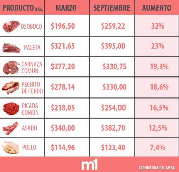 Tal es el caso de la carne. De acuerdo a los informes de precios minoristas que todos los meses releva la Cámara de la Industria y Comercio de la Carne (Ciccra), la carne en carnicerías y supermercados del conurbano bonaerense y la Ciudad aumentó, en promedio, 20% desde marzo a septiembre.