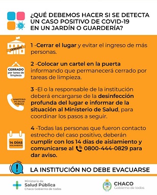 Este protocolo determina que ante un caso confirmado de un niño, niña o trabajador de una guardería maternal o jardín de infantes, se deberá proceder de la siguiente manera: