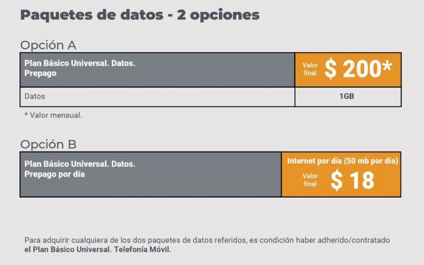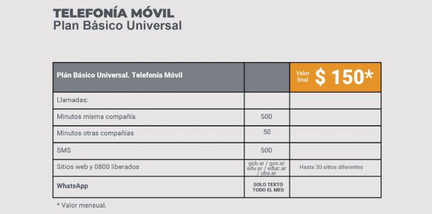 Se trata del plan de $150 por mes. Contempla sólo el acceso a telefonía celular, SMS y mensajería de texto por WhatsApp ilimitada, pero sin acceso a videos ni fotos. Si se quiere obtener conectividad, añadiendo $200 mensuales se podrá contar con 1 Giga de Internet.